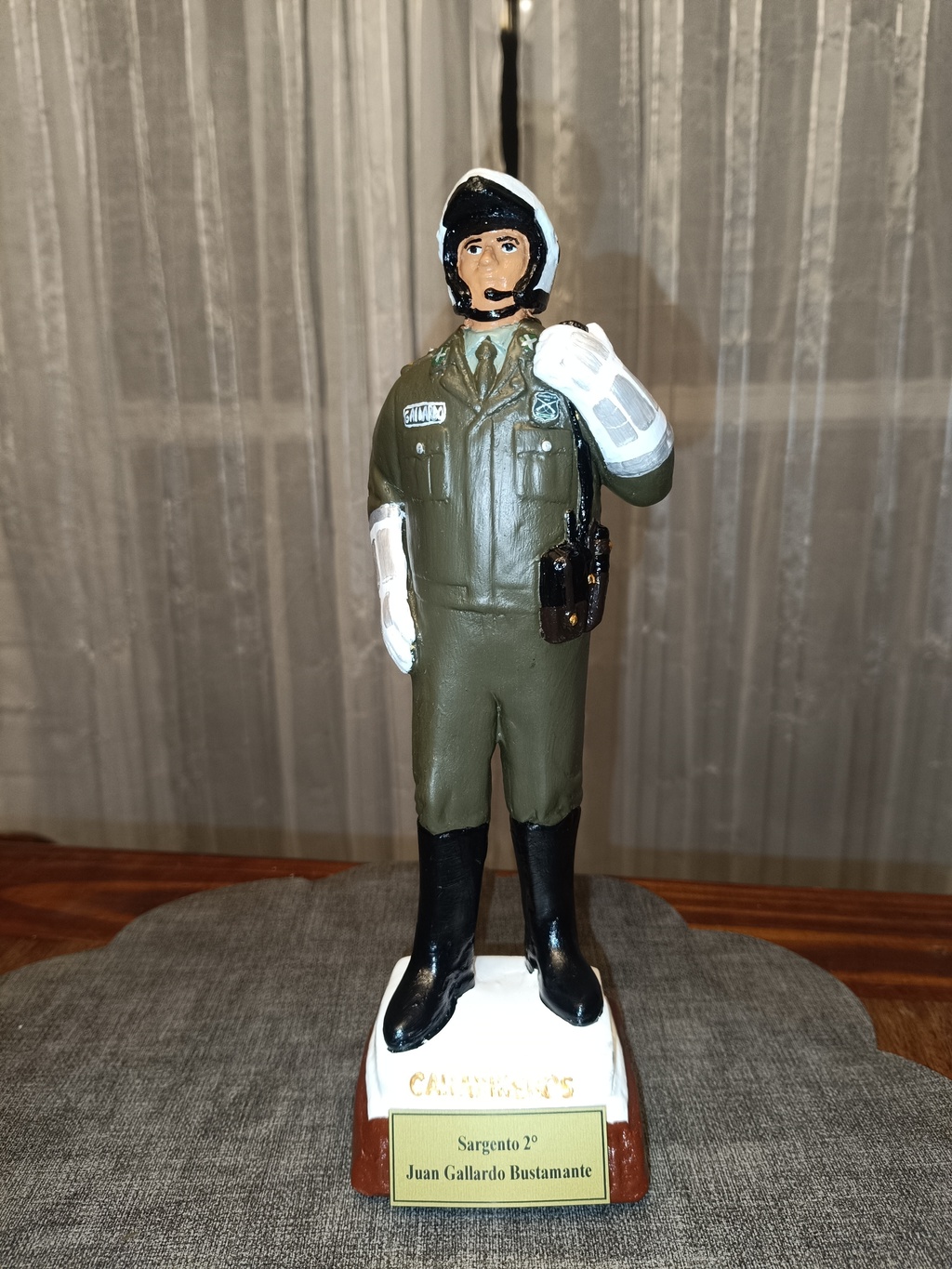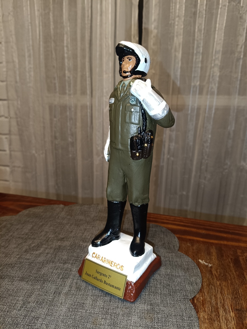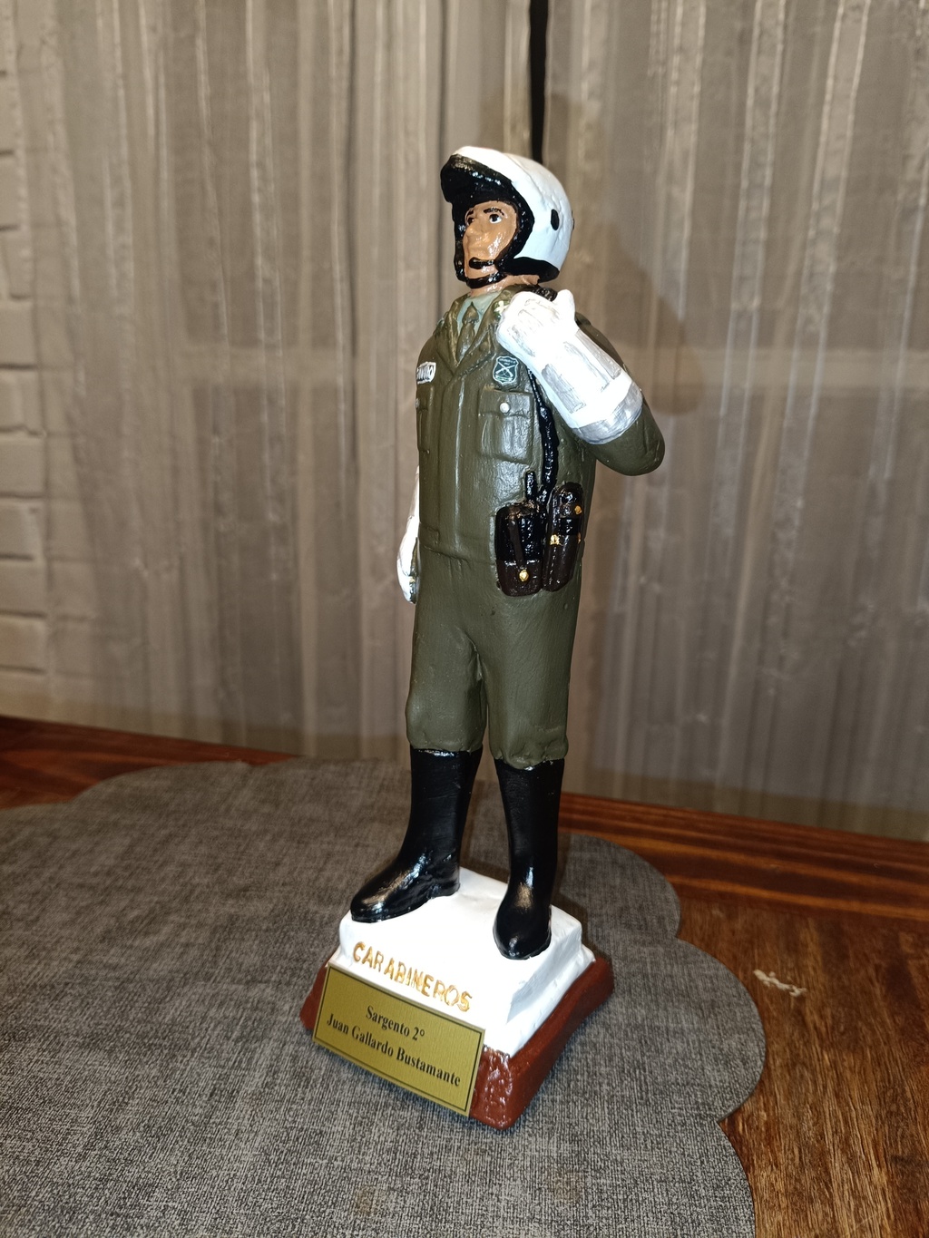 Figura de carabinero motorista de tránsito, fábricada en yeso, 25 cms de altura, está cuenta con base fija y placa grabada a láser con texto personalizado