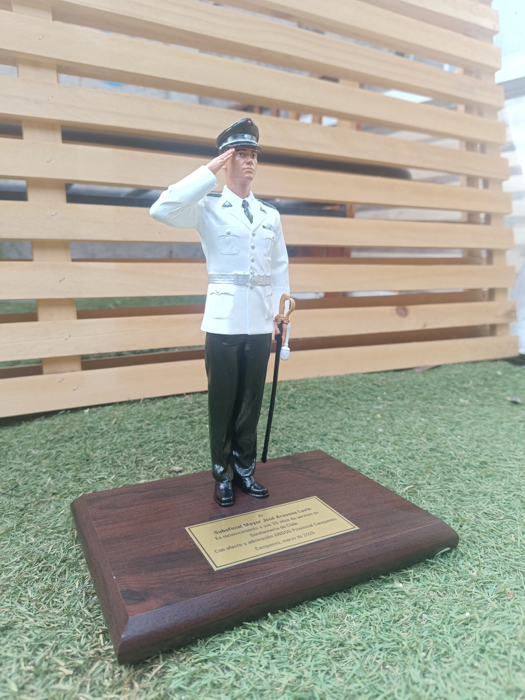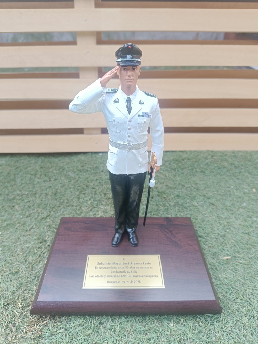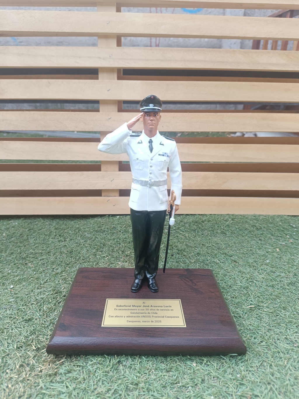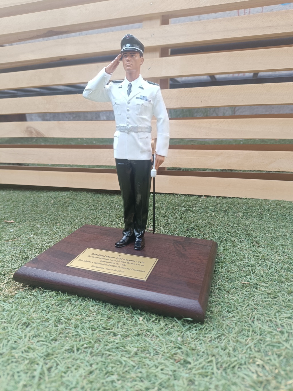 Figura fabricada en resina de oficial o suboficial de gendarmería de Chile, con sable, base de madera y placa grabada laser